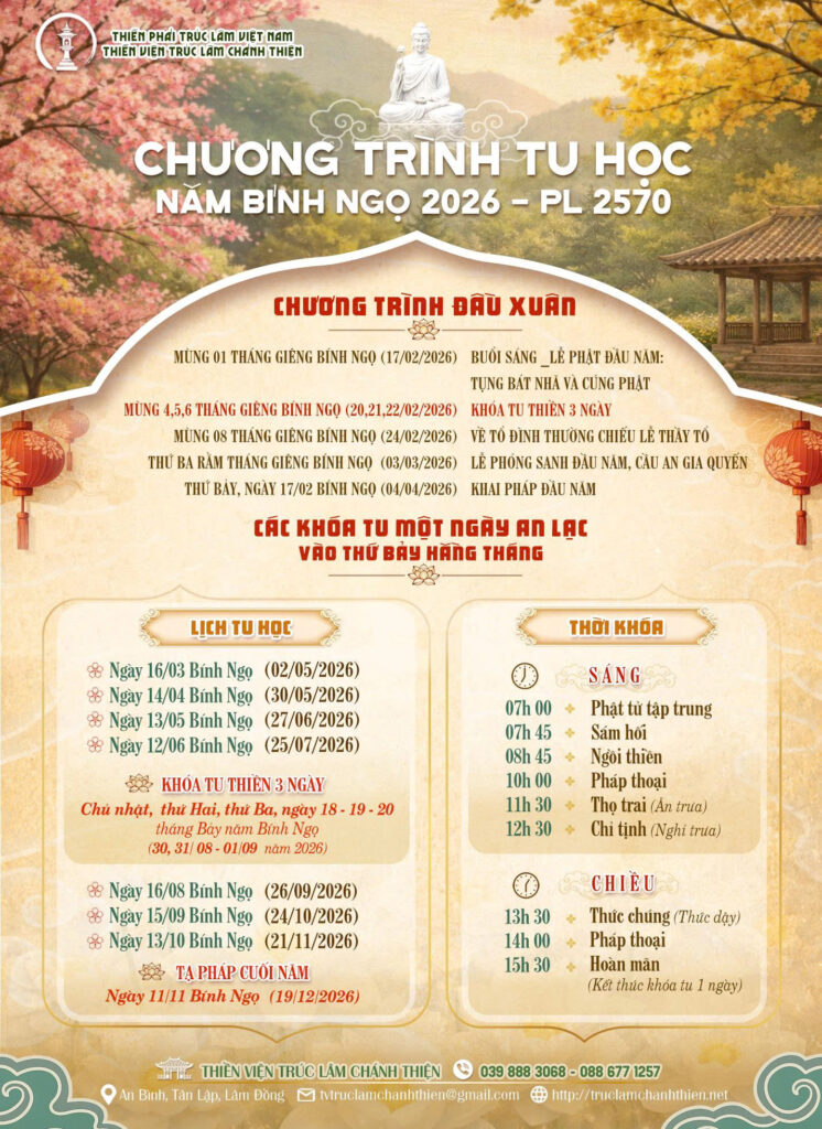 CHƯƠNG TRÌNH TU HỌC NĂM 2026 – TVTL CHÁNH THIỆN 23/02/2026 admin Chương Trình Tu Học, Tin tức, Uncategorized Views: 438 2026, khoatu1ngay, Khoatu3ngay, lichtuhoc, tuhoc